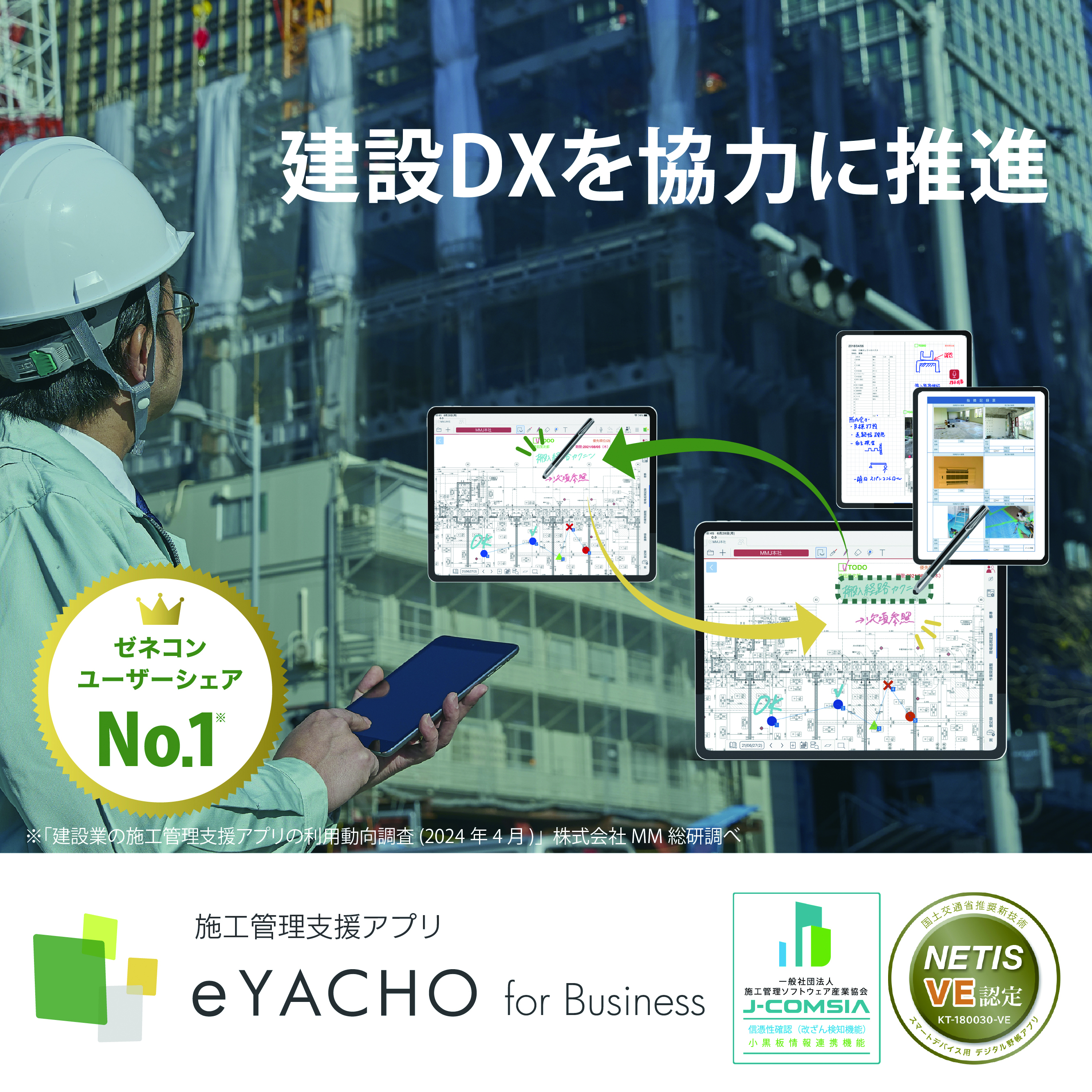 製品名:施工管理アプリ「eYACHO」 ・NETIS-VE(KT-180030-VE) ・J-COMSIA |