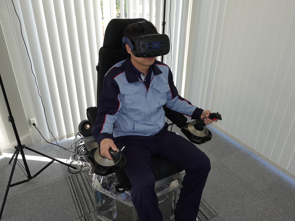 無人化施工VR技術は、無人化施工技術における遠隔操作式建設機械の視界や音、傾き、振動をVRコクピット(仮想現実操縦席)で再現し、実際の搭乗操作感覚をリアルに体感できる技術です。
