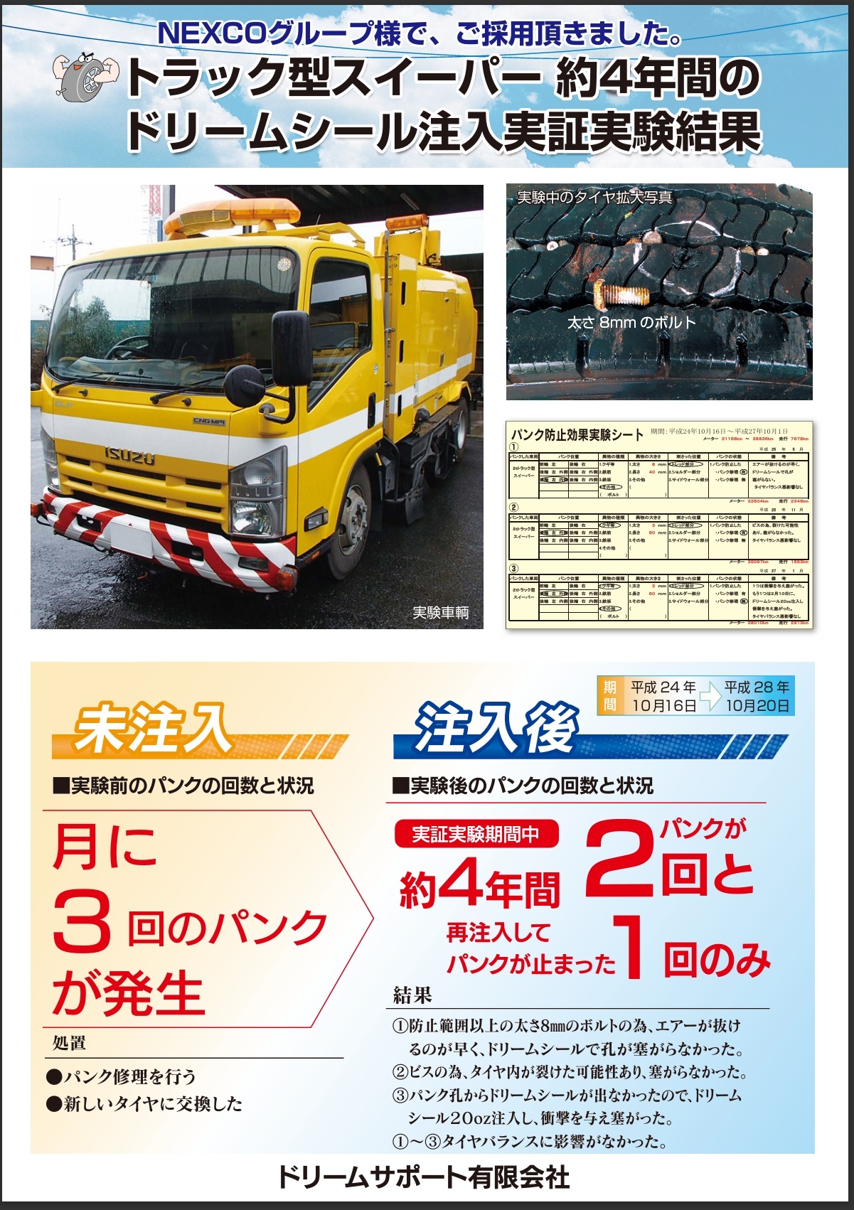 事前に、タイヤ内に水溶性のパンク防止・燃費向上剤乗用車・トラック用「ドリームシールエコ」を注入する事で太さ6,5㎜迄の釘突き刺しパンク防止します。又、トラック・建設機械用「ドリームシールコンバット12」を注入することでトラックタイヤ太さ鉄筋10㎜迄、建機タイヤ太さ12㎜迄の鉄筋突き刺しパンクを防止し、自然空気漏れとタイヤ冷却の相乗効果で燃費向上・CO2削減、タイヤ寿命が延長が実現します。 |