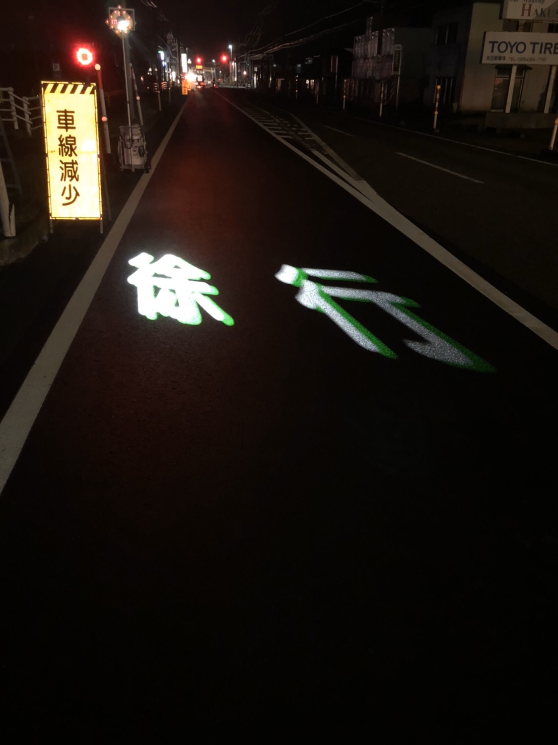 技術の概要・特徴 | 路面や壁面に対して、交通に必要な情報を投影し、ドライバーに明確に伝達します。車線誘導など、シーンに応じた行動喚起が可能です。 |