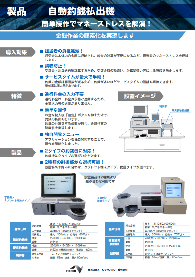 ・係員が操作する収受機と連動して、おつりの払出を補助します ・お金を投入後「確定」ボタンを押すだけで計算をすることなくおつりの払出が行えます ・少ない操作で収受業務を実施いただけます |