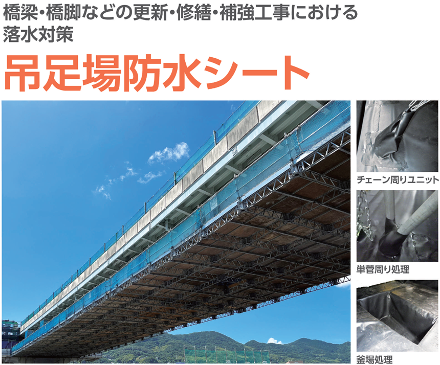 技術の仕様 | 橋梁・橋脚などの更新・修繕・補強工事において、ウォータージェットなどを使用する際に発生する足場からの作業水の落水対策として、吊足場防水シート工法(利水シートPV)が有効です。吊チェーン部分にも工場製作したアタッチメントを現場溶接することにより、高い止水性を確保します。 |
