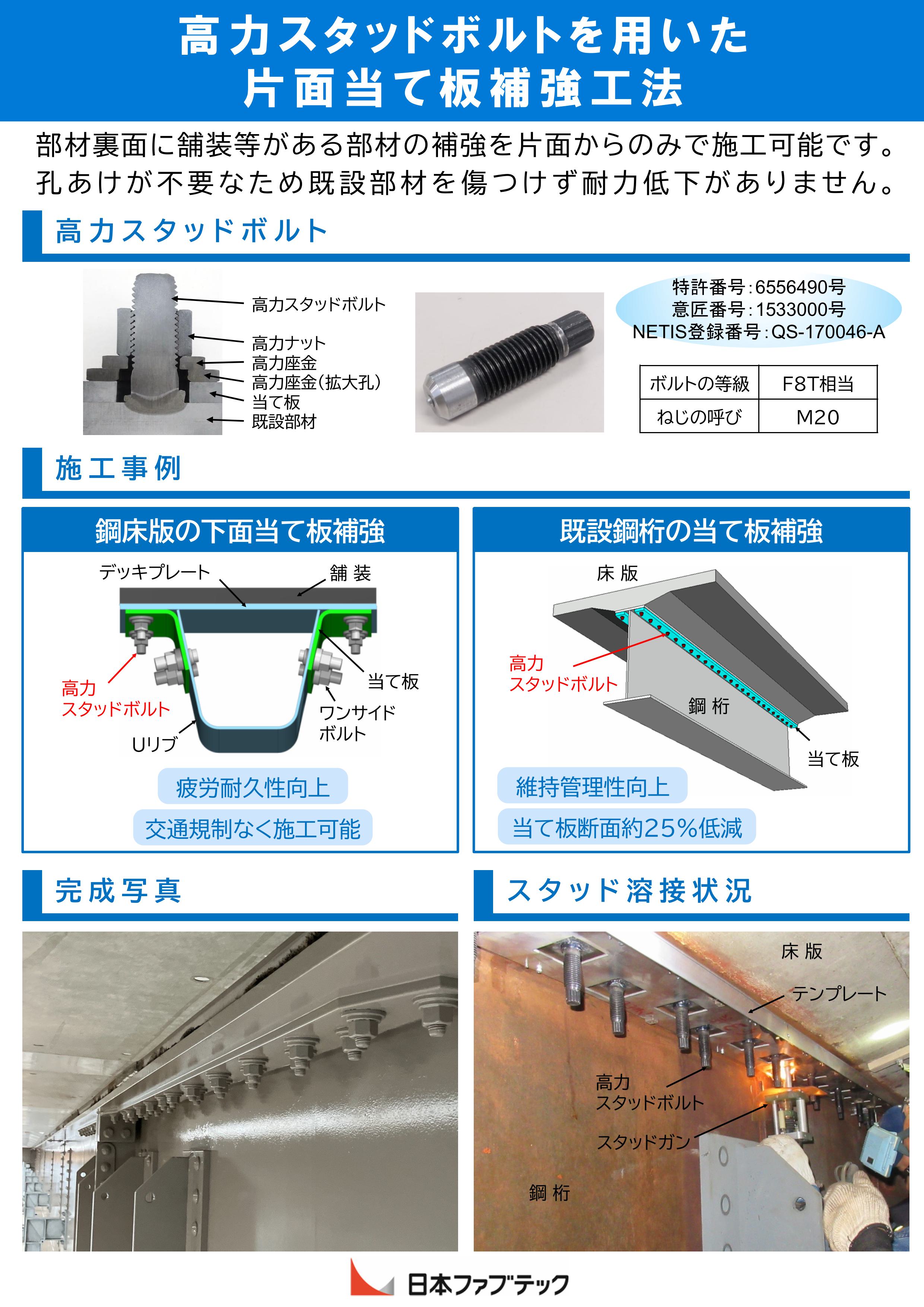 当て板補強とは、老朽化し耐荷力が低下した橋桁に対して補強材を設置することで耐荷力を向上させる工法のことです。一般的な高力ボルトを用いた場合、鋼床版などの閉所では施工ができないため、閉所でも片面から当て板を設置することが可能な高力スタッドボルトによる当て板補強工法を開発しました。 高力スタッドボルトを用いると、鋼部材の当て板補強が片面からのみで施工できます。 鋼部材にスタッド溶接するため既設部材へのボルト孔あけが不要となり、既設部材の耐力低下が生じません。 |