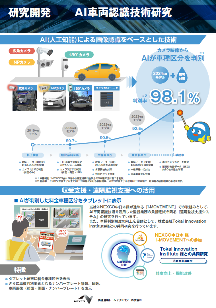 | 技術の概要・特徴 | 本技術は3つのカメラ画像からAIが料金車種区分を判別する仕組みです。料金所収受業務の支援を目的に、本技術で得られる車種判別結果をタブレット端末に表示する収受支援システムを構築しました。収受支援システムでは車種に加えて軸数やナンバープレート情報も表示し、ブースから出て確認する負担を軽減できるうえ、履歴管理機能により撮影した画像と判別結果を後追い検索することが可能です。 |