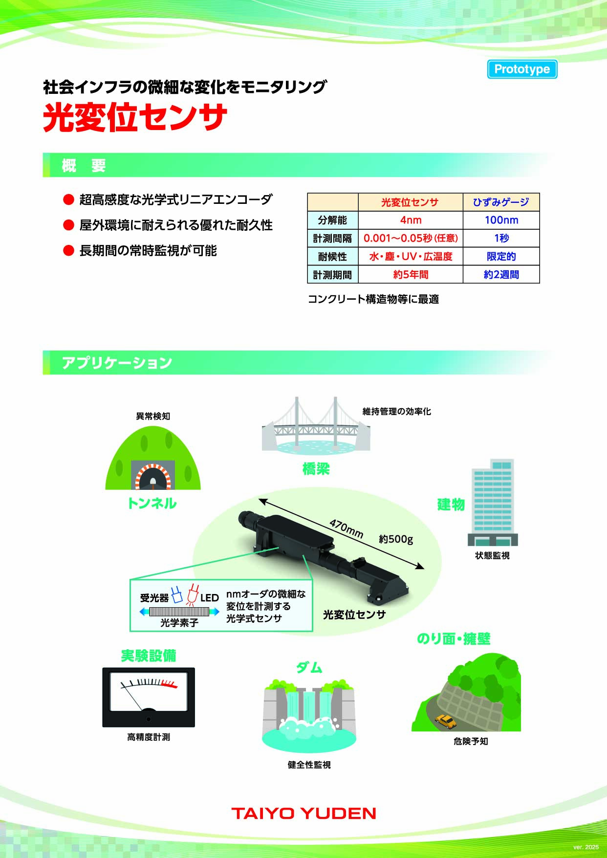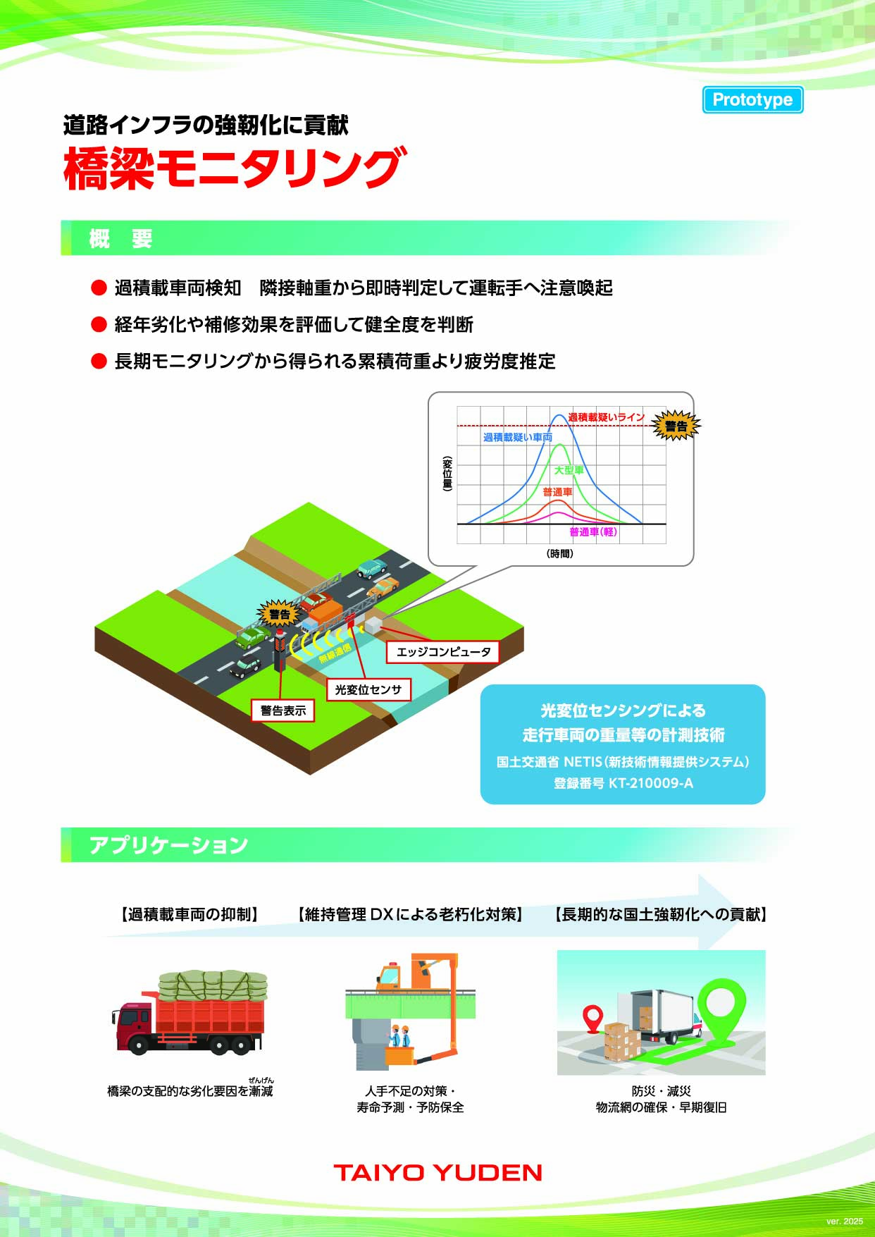 インフラの老朽化という社会課題に対して、橋梁モニタリングソリューションを提案します。当社の高感度・高耐久の光変位センサで床版の劣化や残存プレストレス量を検出します。さらに橋梁の健全性を定期/常時モニタリングすることにより、維持管理の効率化に貢献します。 橋梁の劣化や損傷に対して影響度の大きい大型車両の過積載を検出することもできます。 |