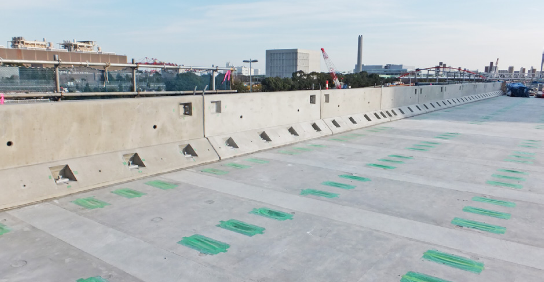 EMC壁高欄は、従来の壁高欄と比べて取替性や耐久性を改良した、NEXCOの「構造物施工管理要領」の要求性能を満たすフロリダ型のプレキャスト壁高欄です。