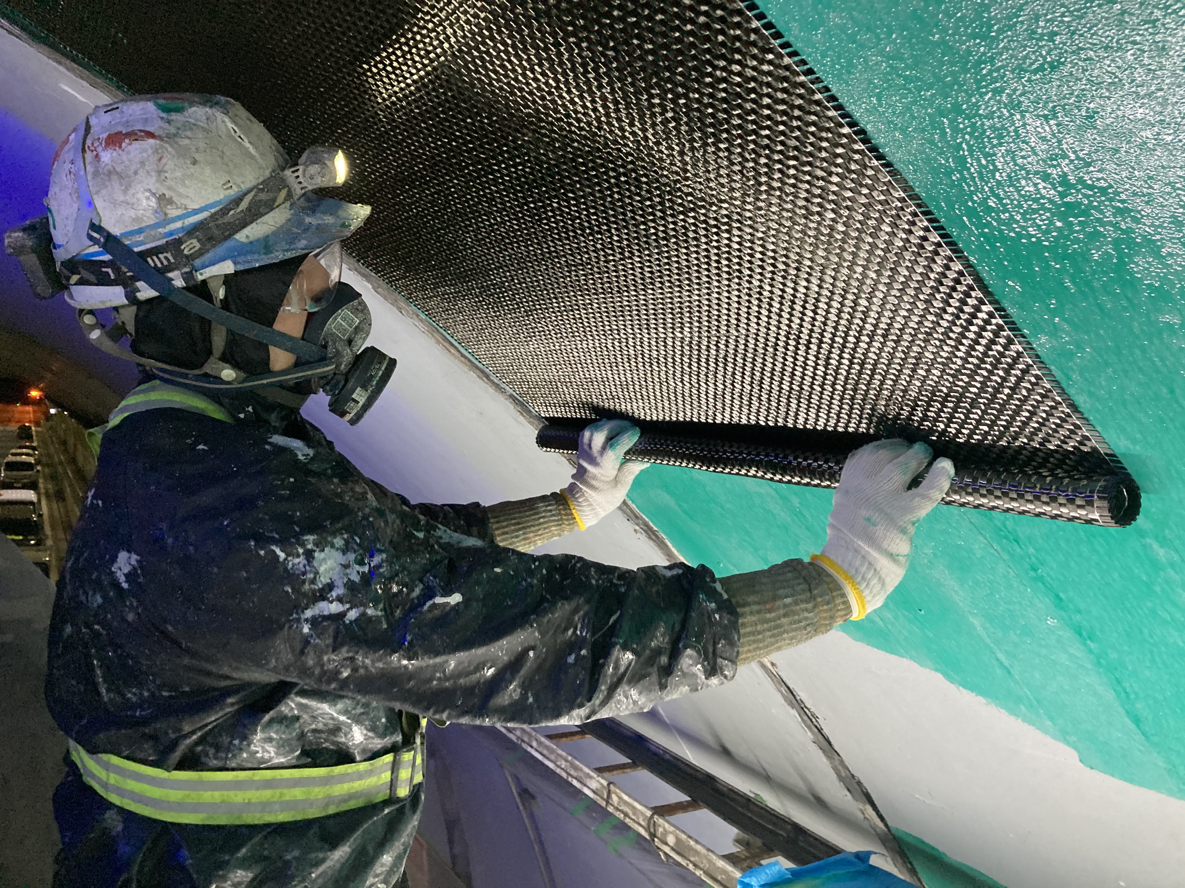 ■施工効率の向上 ・1層施工で済むためシート貼付け作業が半減 ・シートの大判化(幅500から1000mm)により施工効率が向上 ・使用樹脂量は1.2kg/m2から0.8kg/m2に低減 ・覆工補強工の施工効率が約2.5倍向上 ■工程の短縮 ・補強工程は11工程から8工程に短縮 ・補強工事の工期を約20%短縮し、交通規制期間や規制コストの縮減、ソーシャルロスの低減効果も期待できる ■品質の確保 ・高目付2方向(目付量:経200g/m2、緯200g/m2)かつ、高強度 (引張強度2900N/mm2以上、静弾性係数245±36kN/mm2)の炭素繊維シートにより、1層で従来2層と同等の補強効果を確保 ・繊維交点に設けた含浸孔により、樹脂の含浸性を確保 ・1層施工のため、層間の接着不良が生じない |