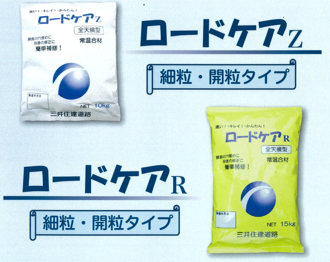 「ロードケアZ・R」は、袋詰めなので誰でも手軽に持ち運びできます。オールインワンタイプですので、袋から出してすぐご使用になれます。「ロードケアZ」は耐久性に優れ、「ロードケアR」は経済性に優れています。用途に合わせて、細粒・開粒タイプを用意しております。