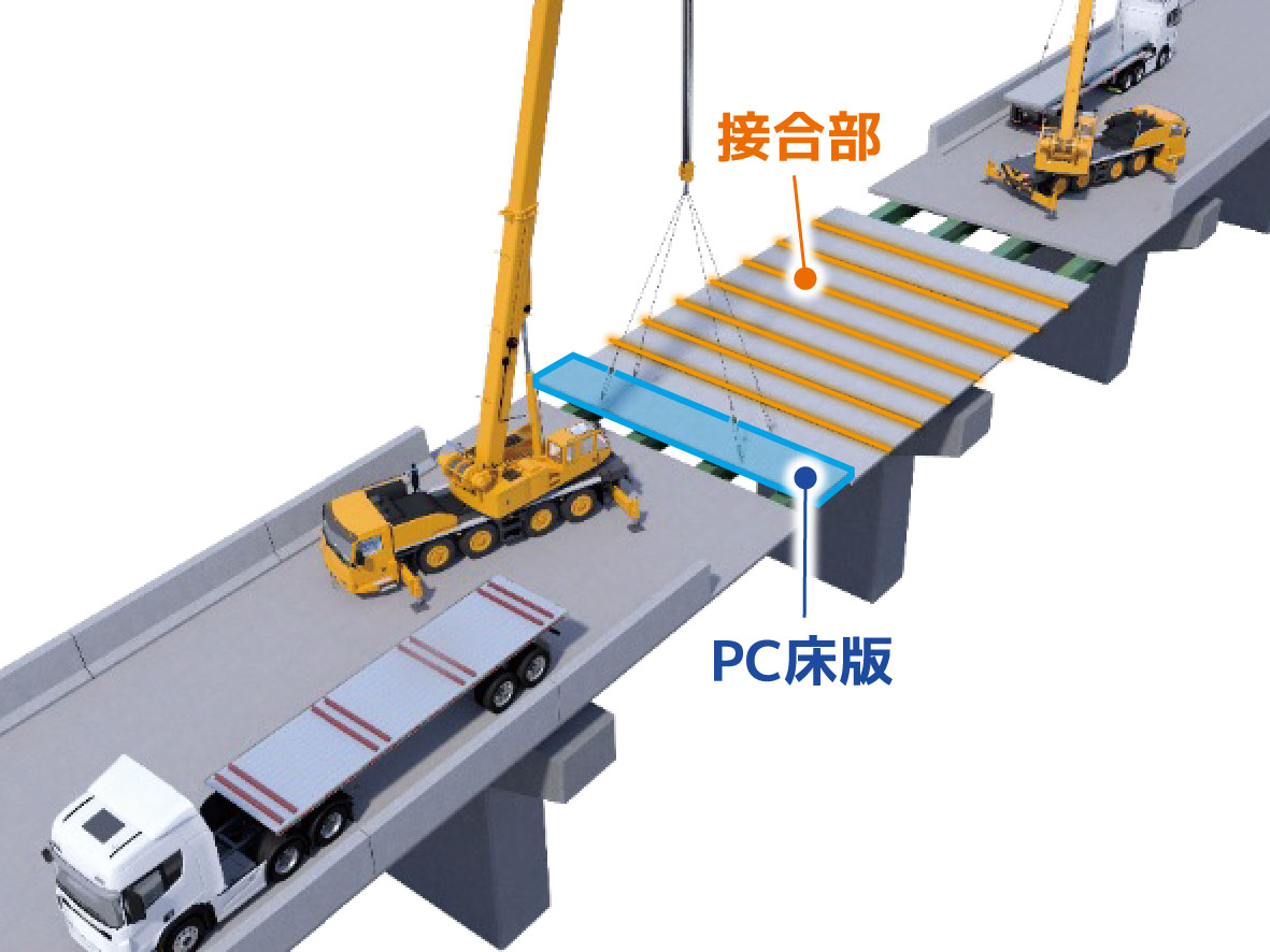 ●接合幅の縮小 従来の400mmから100~180mmに短縮 ●橋軸直角鉄筋の不要化 従来の工法で必要とされていた橋軸直角鉄筋が不要 ●間詰体積の縮小 間詰体積が従来工法の40%に縮小 ●高い疲労耐久性 水張り状態での輪荷重走行疲労試験において、100年相当以上の疲労耐久性を確認 |