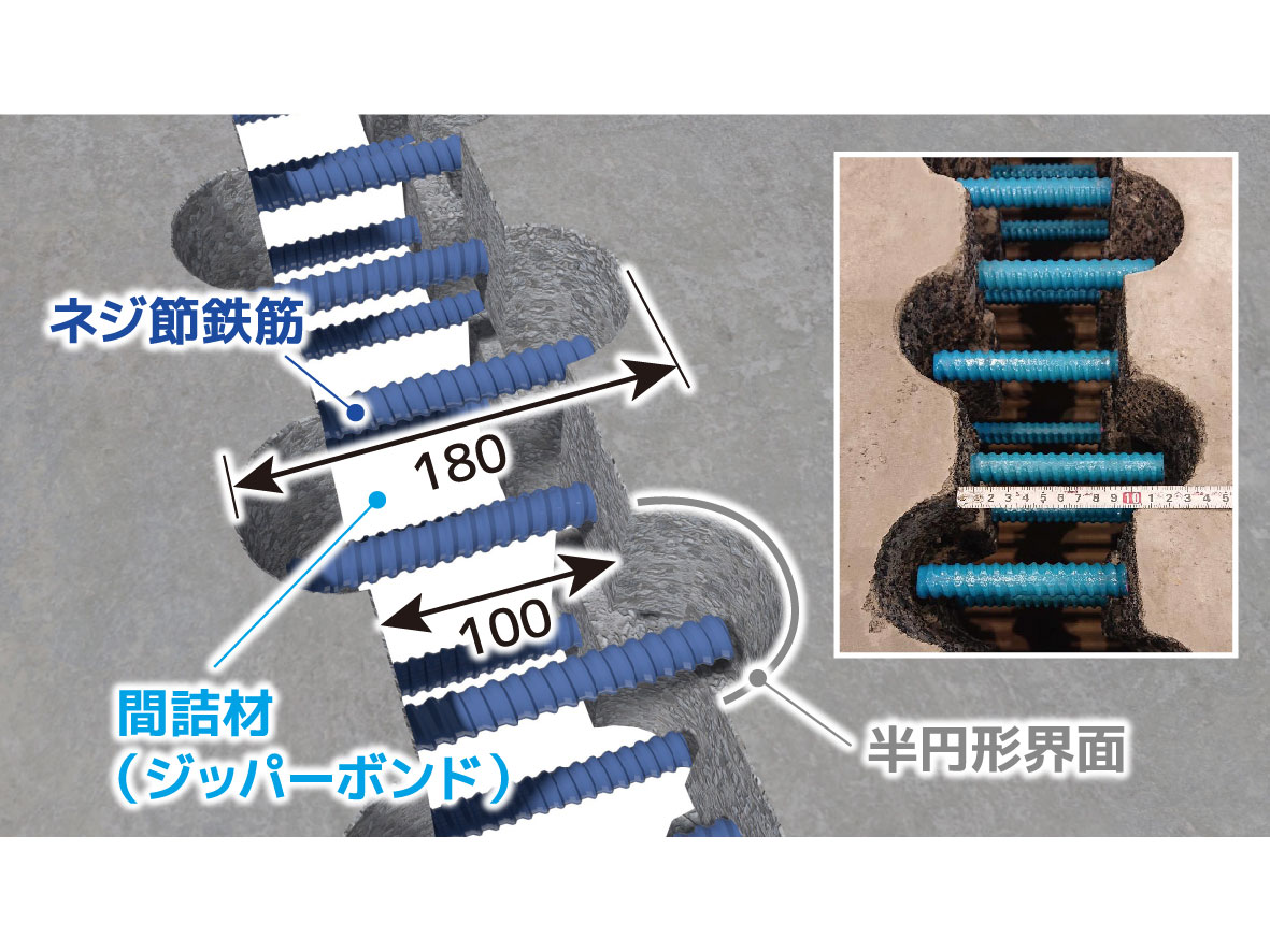 技術の概要・特徴 | 『ジッパージョイント工法』は、間詰材に常温硬化型の高強度繊維補強モルタルを用いたネジ節鉄筋による床版のあき重ね継手です。接合部を合理化(半円形界面)し、間詰材の打設数量を削減することで、施工の省力化を図りました。 |