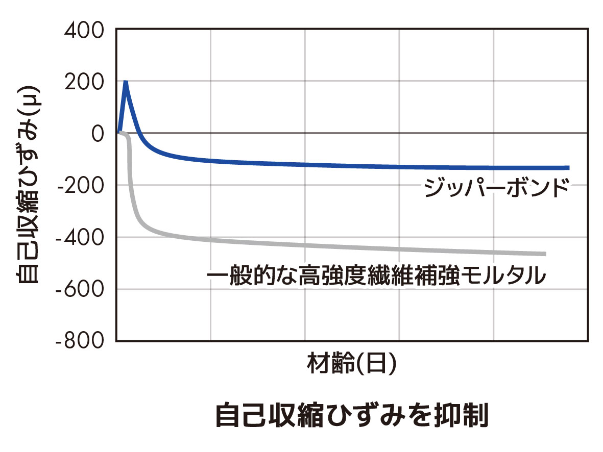 『ジッパージョイント工法』は、間詰材に常温硬化型の高強度繊維補強モルタルを用いたネジ節鉄筋による床版のあき重ね継手です。接合部を合理化(半円形界面)し、間詰材の打設数量を削減することで、施工の省力化を図りました。