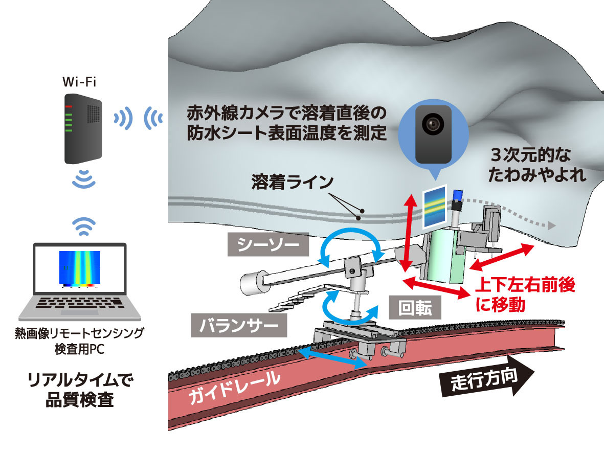 そこで当社は、大栄工機(株)と共同で防水シートの自動溶着システムを開発し、作業員の技量によらず、足場に上ることなく操作者1人で防水シートを確実に溶着することを可能としました。さらに、熱画像リモートセンシング検査技術を搭載することで、溶着をしながらリアルタイムに溶着品質を自動で全数確認することを可能としました。