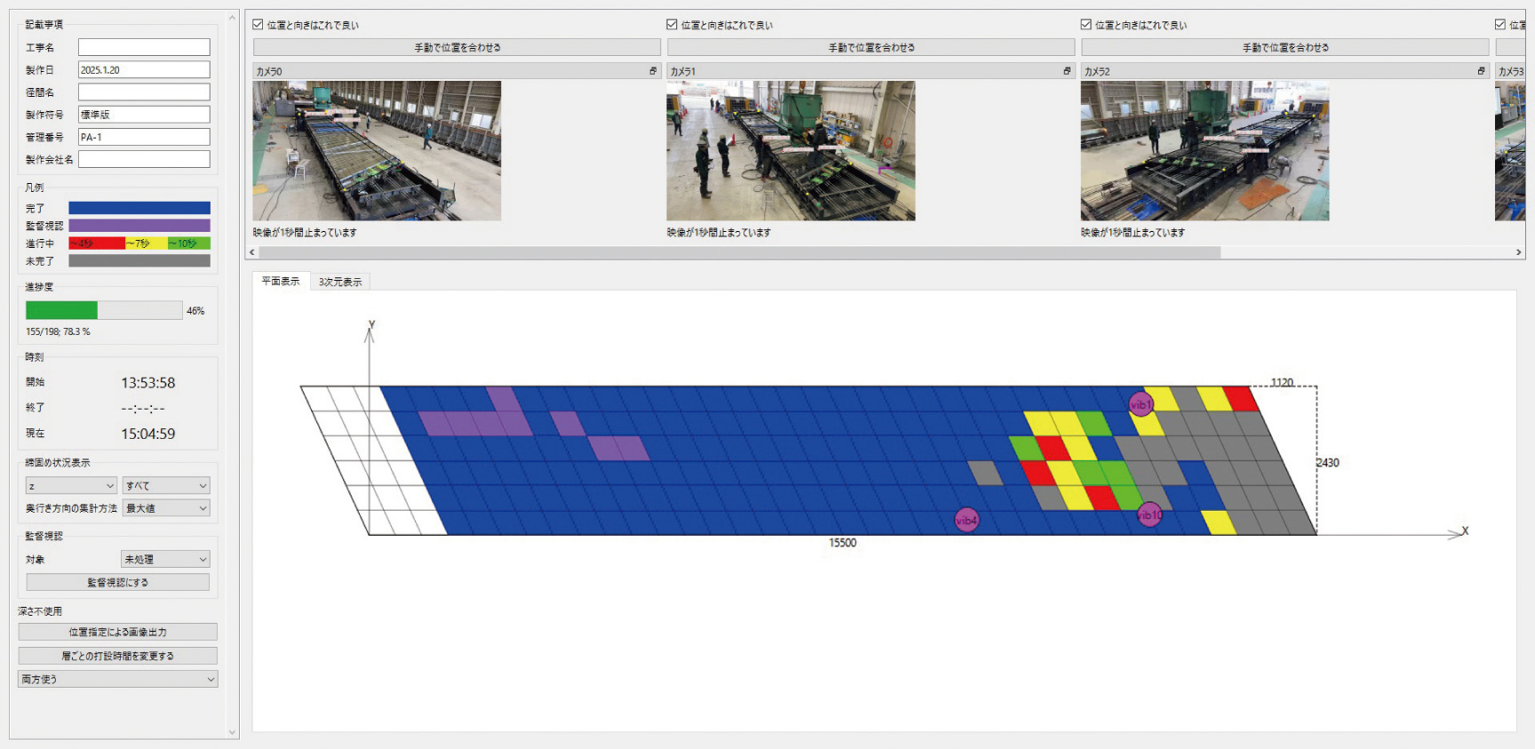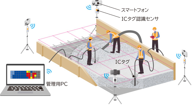 ① 死角なく締固め作業を管理可能 画像認識AIによる検知だけでなく、ICタグでの検知補完により、管理の抜けを防止し、確実な管理を実現します。 ② 締固め管理の省力化が可能 スマホ・ICタグ認識センサ・管理用PCのみの構成なので設置が容易で、PC画面で施工範囲全体の進捗を確認できるため、少ない監督員で打込み範囲の締固め管理を準備・運用できます。 ③ 効率よく品質確保可能 PC上での可視化により、締固め不足が生じることを防ぎ、コンクリートの品質を確保できます。 |
