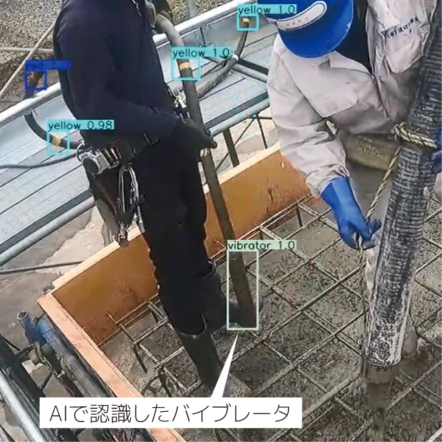 本技術は画像認識AIによりバイブレータを自動検出して締固め位置と時間を可視化し、締固めの進捗を定量的に管理することでコンクリートの打込みに伴う初期欠陥を未然に防ぎ、コンクリート構造物の品質向上に寄与するものです。