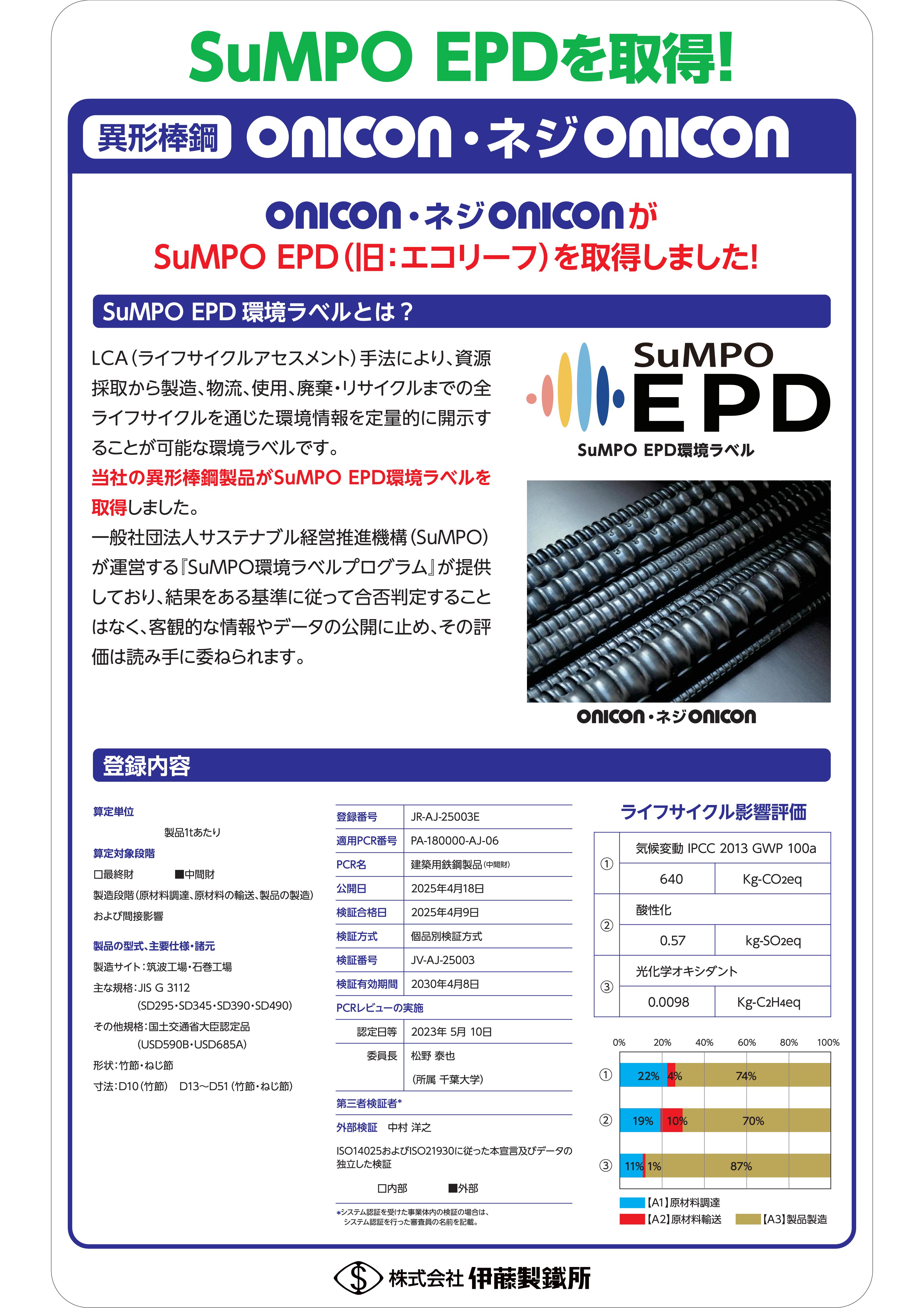 当社の竹節鉄筋『オニコン』とねじ節鉄筋『ネジonicon』がSuMPO EPD環境ラベルを取得しました。