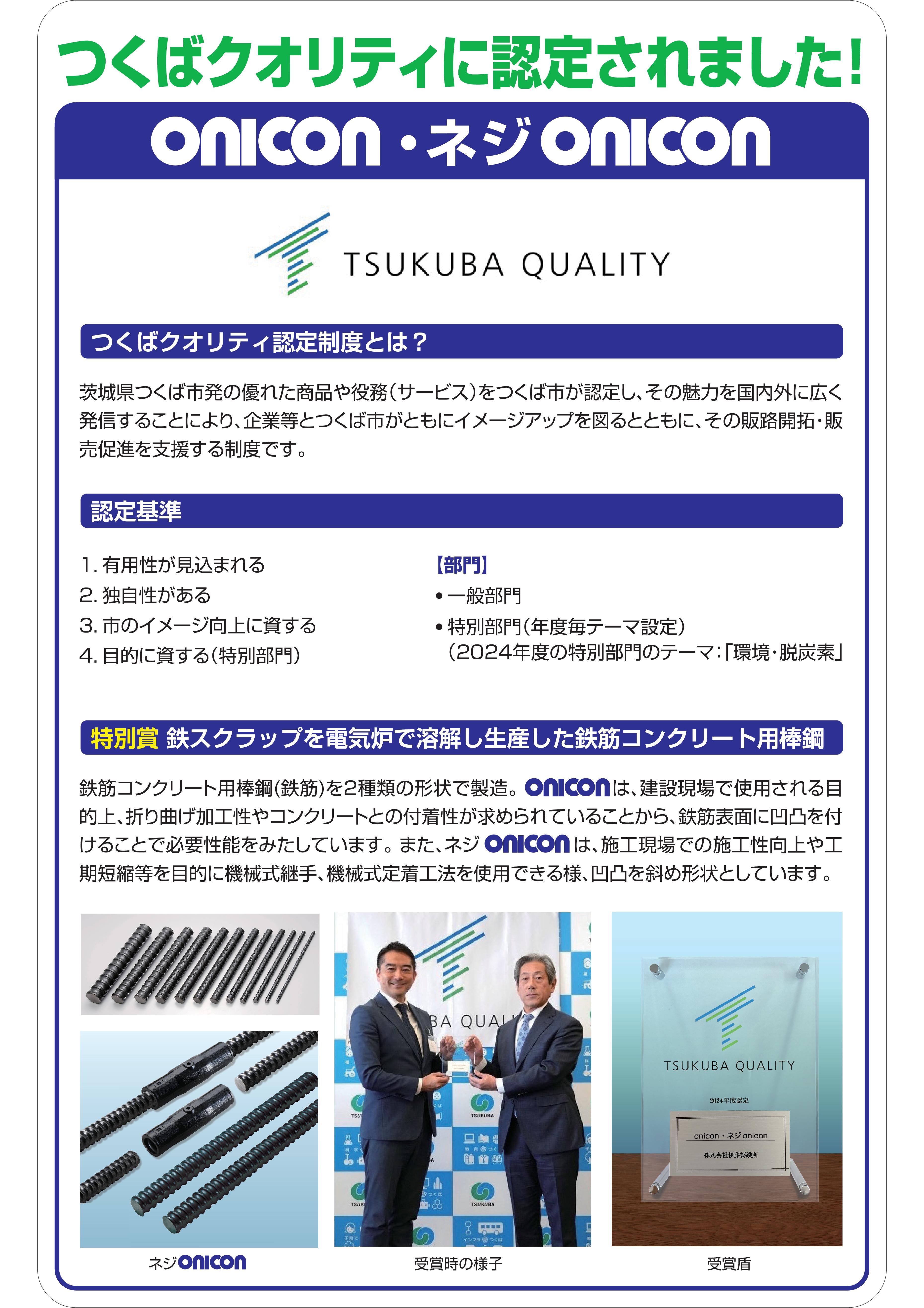 【温室効果ガス排出削減に寄与する製品】 一般に、一貫製鉄プロセスの二酸化炭素排出は粗鋼1t当たり、高炉で2.1t-CO2、電炉で0.53t-CO2と言われています。当社の粗鋼生産量当りのトン当たりCO2排出量は0.35トン程度と温室効果ガス排出削減に寄与しています。また、当社生産性向上が可能な継手定着製品をすることで、在来工法より鉄筋量を削減できるため、CO2削減効果が期待できます。 【SuMPO EPD(旧エコリーフ)】 SuMPO EPD環境ラベルとは、(一社)サステナブル経営推進機構(SuMPO)が運営するプログラムが提供し、LCA(ライフサイクルアセスメント)手法により、資源採取からリサイクルまでの全ライフサイクルを通じた環境情報を定量的に開示することが可能な環境ラベルです。 当社の竹節鉄筋『オニコン』とねじ節鉄筋『ネジonicon』がSuMPO EPD環境ラベルを取得しました。 【つくばクオリティ認定】 茨城県つくば市が認定する、優れた商品や役務の魅力を国内外に広く発信し、企業とつくば市がともにイメージアップを図り販売促進を支援する制度です。 2024年度の特別部門のテーマは「環境・脱炭素」であり、≪鉄スクラップを電気炉で溶解し生産した鉄筋コンクリート棒鋼≫として、当社の竹節鉄筋『オニコン』とねじ節鉄筋『ネジonicon』及び関連商品が特別賞を受賞しました。 |