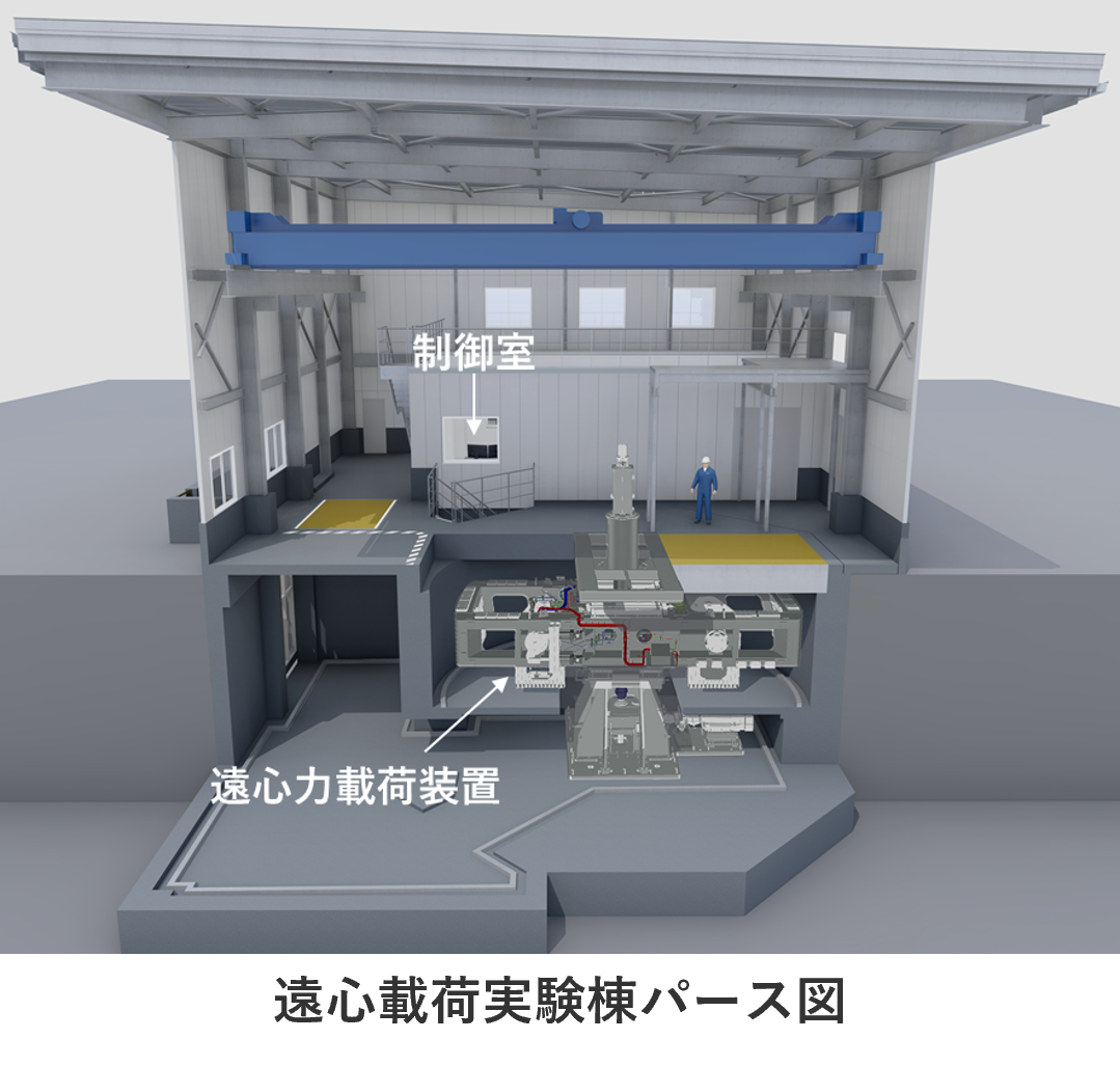 遠心力載荷装置は、地盤や土構造物、地中構造物などの挙動を把握するための模型実験に使用する装置です。回転軸から左右に伸びるアームの先端の揺動架台と呼ばれる部分に小型模型を搭載します。 装置を高速で回転させることで遠心力により揺動架台が振れ上がり、小型模型に大きな重力加速度を作用させることができます。 小型模型に模型の縮尺に応じた重力加速度を作用させることで、実規模と同等の挙動を再現することが可能となります。 |
