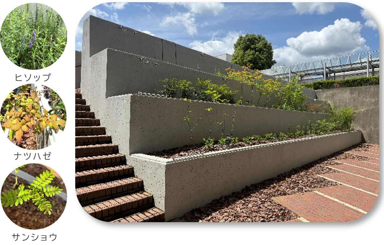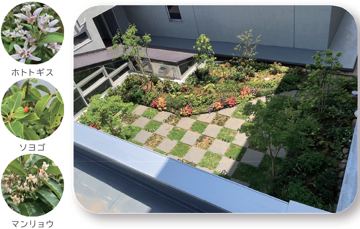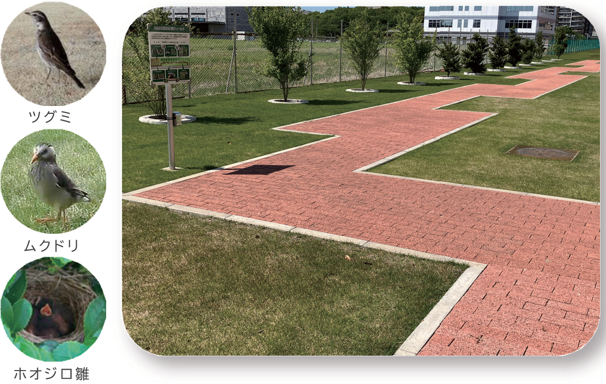 ●生物多様性緑化実証フィールド いきものへの配慮を目的に整備したフィールドです。この場所では、鳥類の生息に寄与していることを確認するために、モニタリング調査を行っています。 ●日かげと緑の実証フィールド 限られた日照条件でも植物が育つことを実証するためのフィールドです。建物の北側など日が当たりにくい場所でも元気に育つ植物を選定し、生育評価を行っています。 ●癒しと薬草の実証フィールド 身近な緑がひとの心とからだの健康に関わることを伝えるフィールドです。食堂前という環境を活かし、“見て楽しい・食べて楽しい植物”を中心に配植しています。 |
