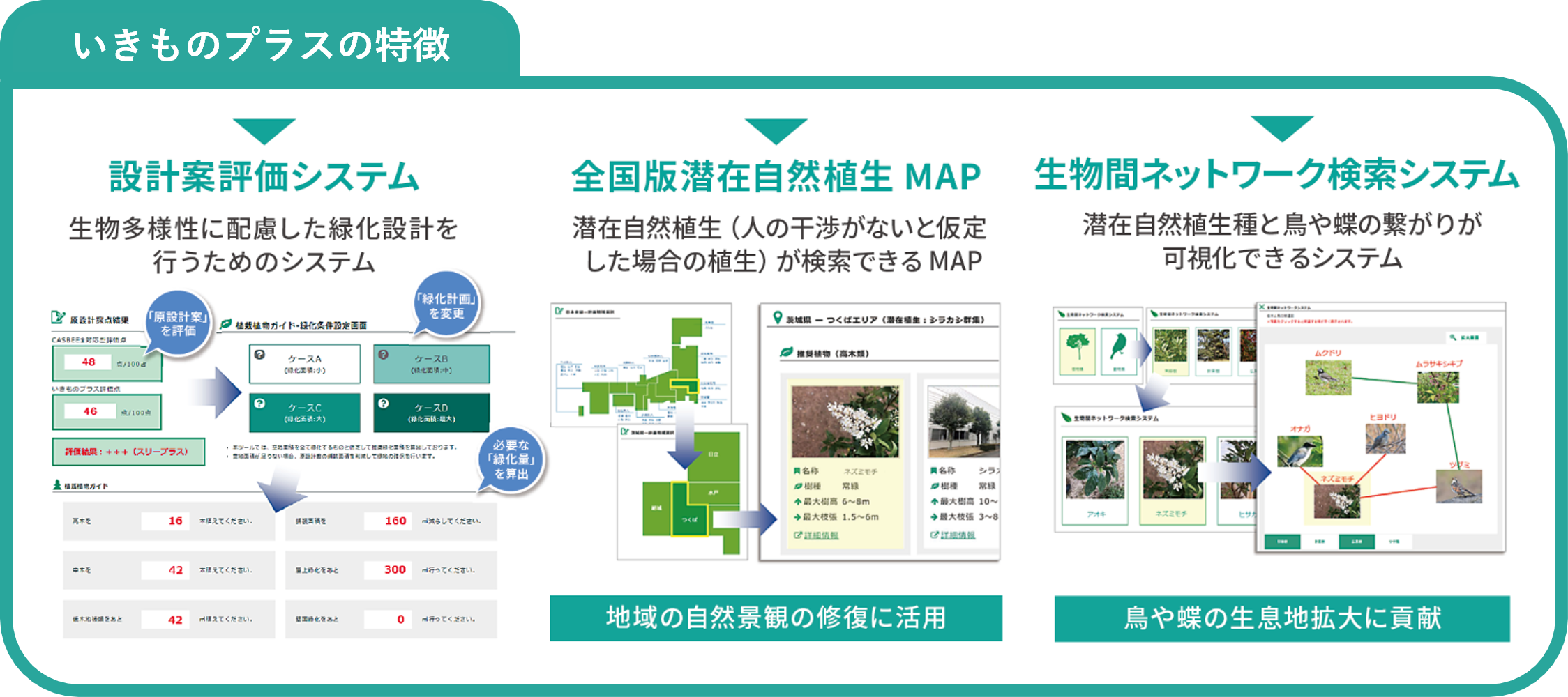 地域に生息する在来の「いきもの」と植物の関係性を評価し、その場所に適した植栽計画を立案するための設計支援ツールです。