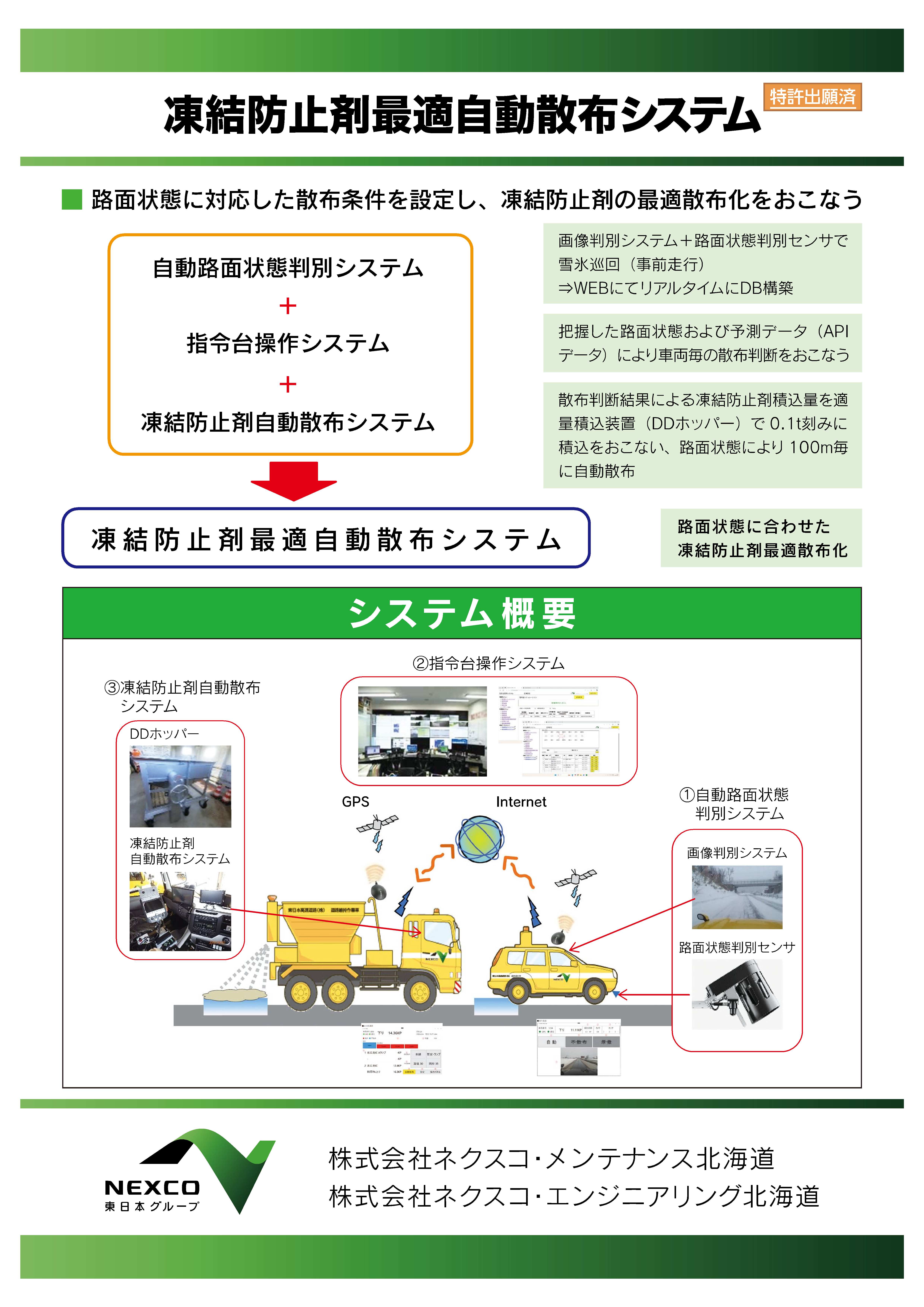 ・路面状態に対応した散布条件を設定し、凍結防止剤の最適自動散布を行う ・巡回車に搭載した自動路面状態判別システムからWEBにてリアルタイムに路面状態把握 ・把握した路面状態および予測データにより、凍結防止剤散布車両ごとに散布量を判断 ・凍結防止剤積込量を最適積込装置(DDホッパー)で0.1t単位で積込み、凍結防止剤を自動散布 |