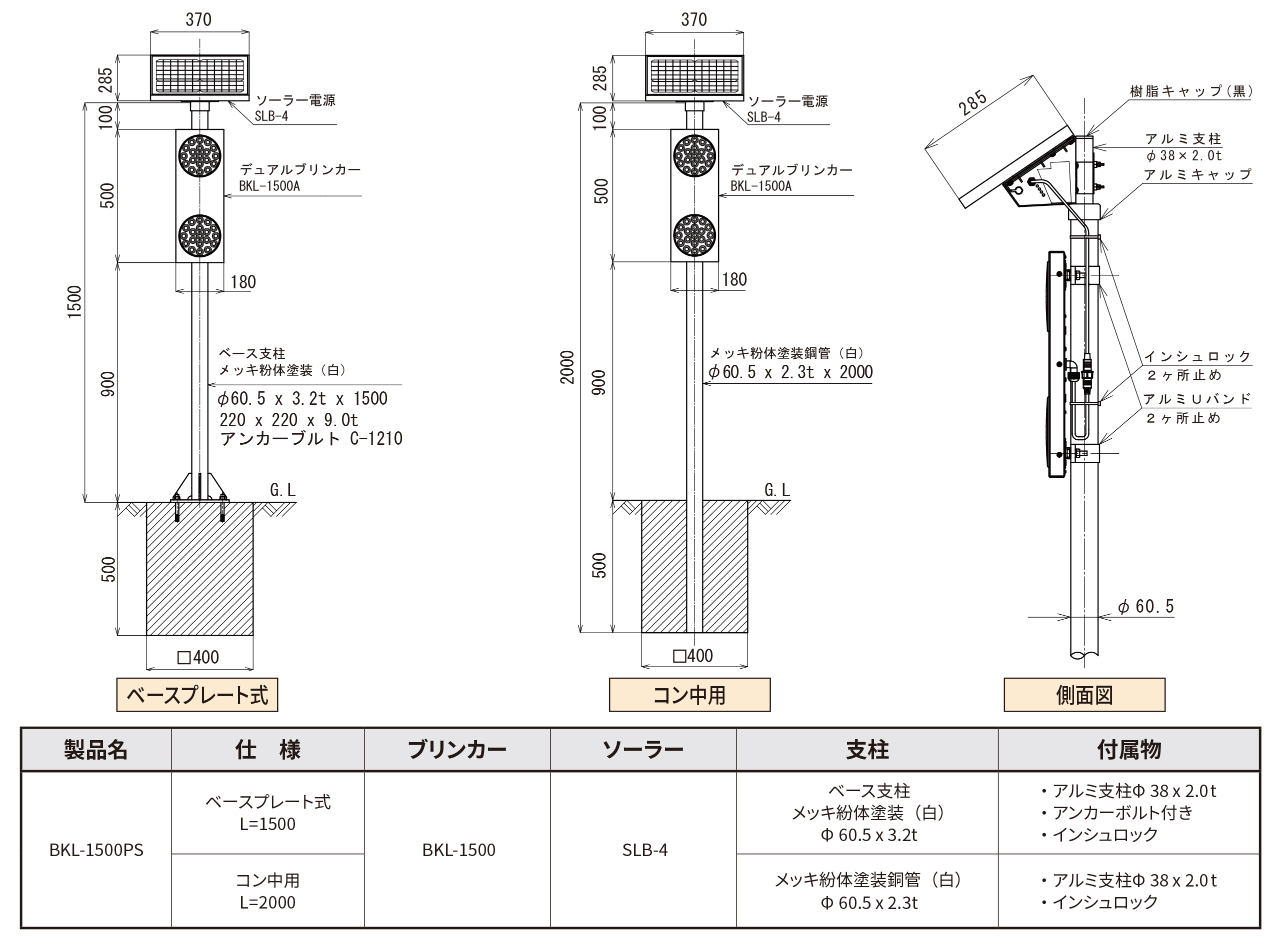 支柱はΦ60.5の鋼管(白)のベースプレート式・コン中用の2種類がございます。