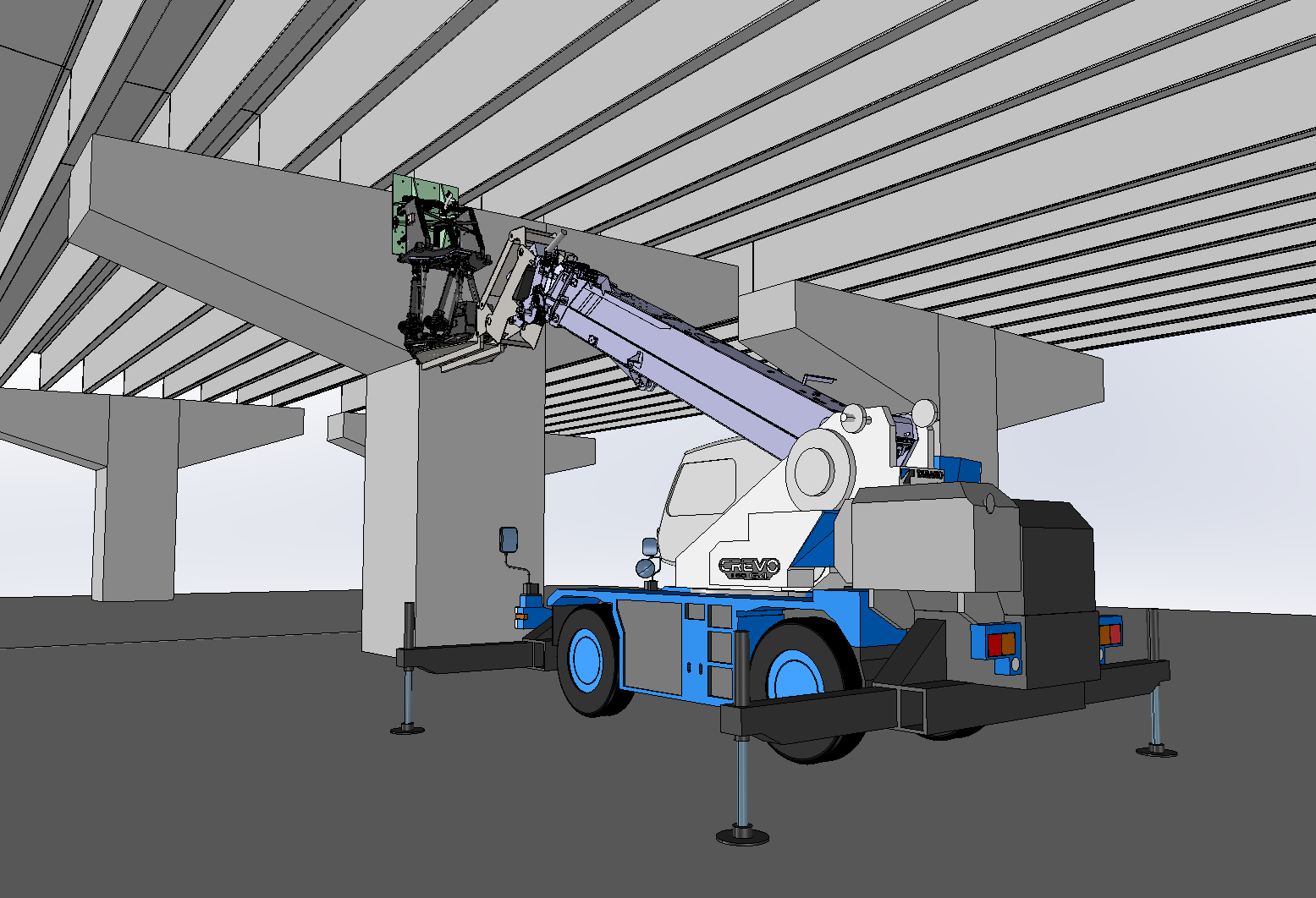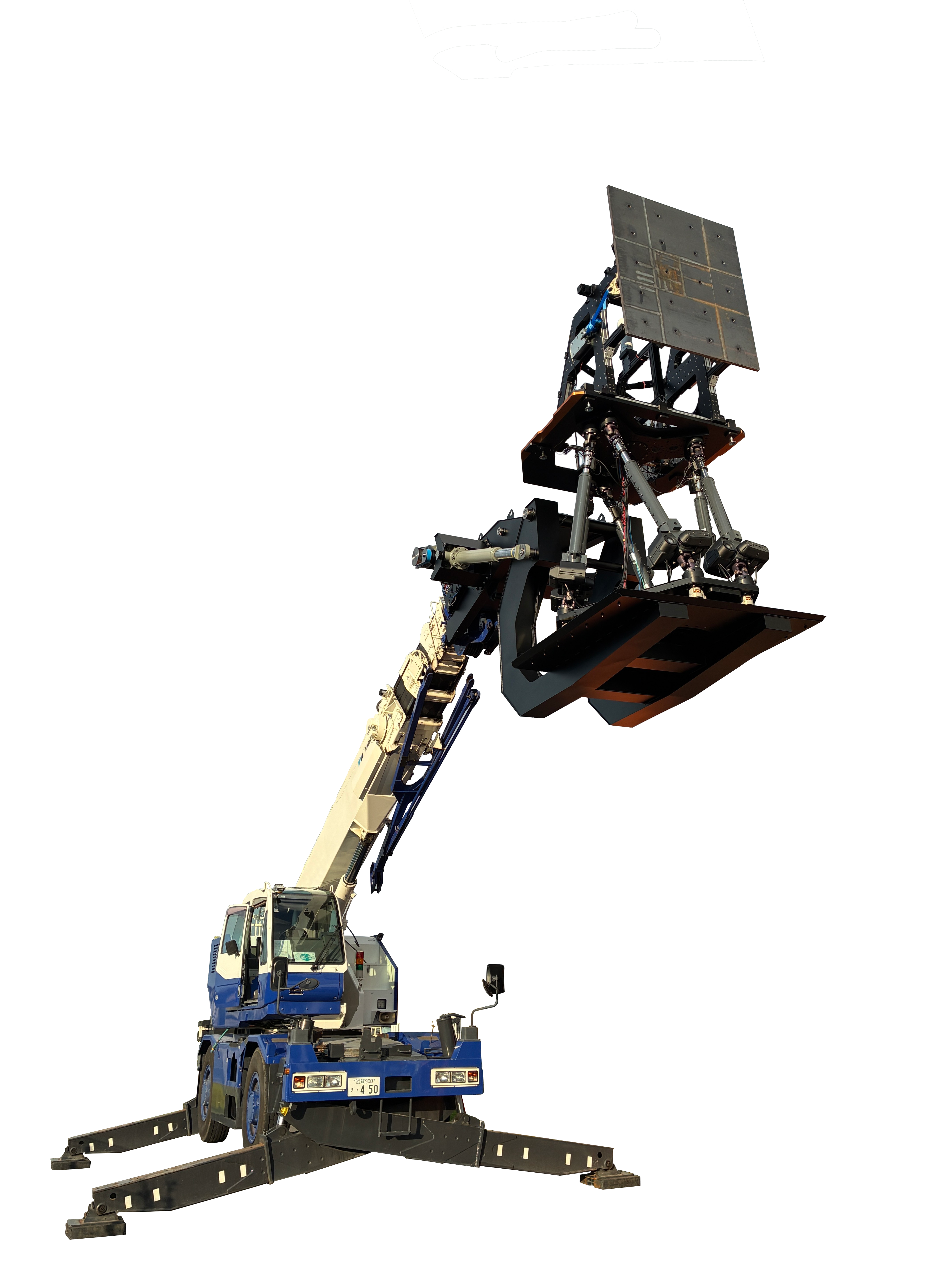橋梁耐震補強用鋼製ブラケット取付ロボット(建設用スチュワートプラットフォーム) は、重量物を保持しながら微小な位置・傾き調整を遠隔操作で行うことができます。このロボットをラフテレーンクレーンなどに取付けることで、ブラケットの揚重から位置合わせ、設置、ボルト仮締めまで,これまで高所作業車上で人力で行っていた作業を安全で効率的に行うことができます。