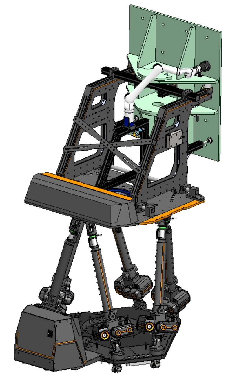 6本の電動シリンダを組み合わせたスチュワートプラットフォームでブラケットを把持し,前後,左右,上下,傾き,回転などあらゆる方向にミリ単位の移動制御ができるため,ブラケットのボルト穴にアンカーボルトを通して取り付けるという微細な作業が可能です。 |