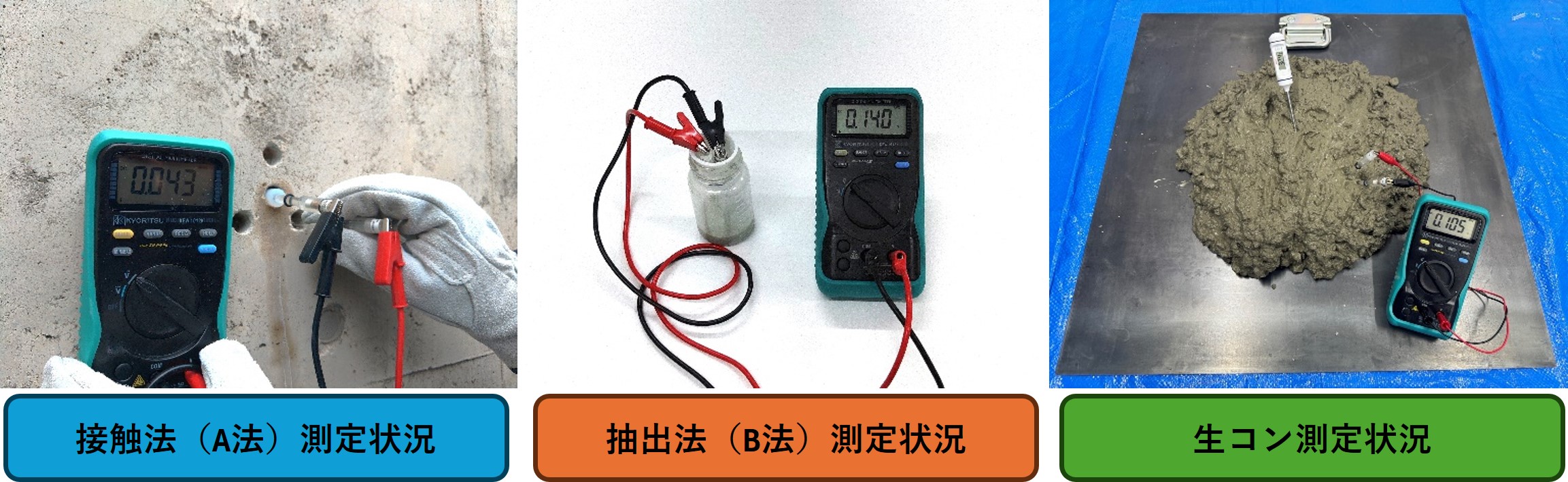 技術の仕様 | 塩分センサ(銀塩化銀電極)、基準電極(飽和KCl銀塩化銀電極)、および直流電圧計の3点を用いて、測定対象物を介した電位差(mV)を測定し、換算式より塩化物イオン量(kg/m3)を求める。 |