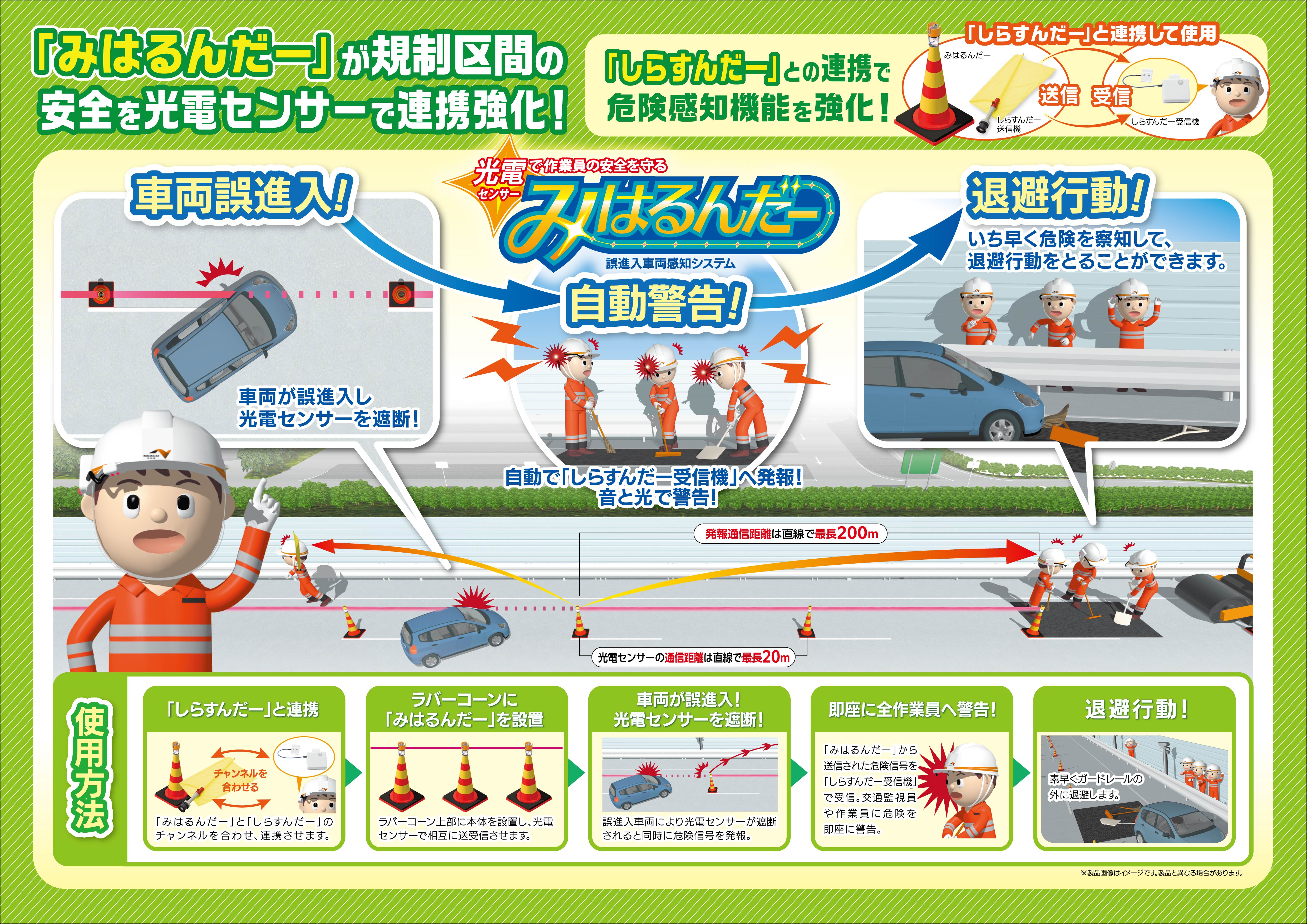 交通規制に誤進入する車両を検知して作業従事者へ危険を通知するシステム。ラバーコーンの上部へ「みはるんだー」を設置し光電センサーの送受信により赤外線で監視をする。ラバーコーンに接触又はすり抜けにより受信部が赤外線が遮られると類似技術「緊急避難信号送受信装置システム(しらすんだー)」を介して、作業従事者に瞬時に確実に危険を通知する。