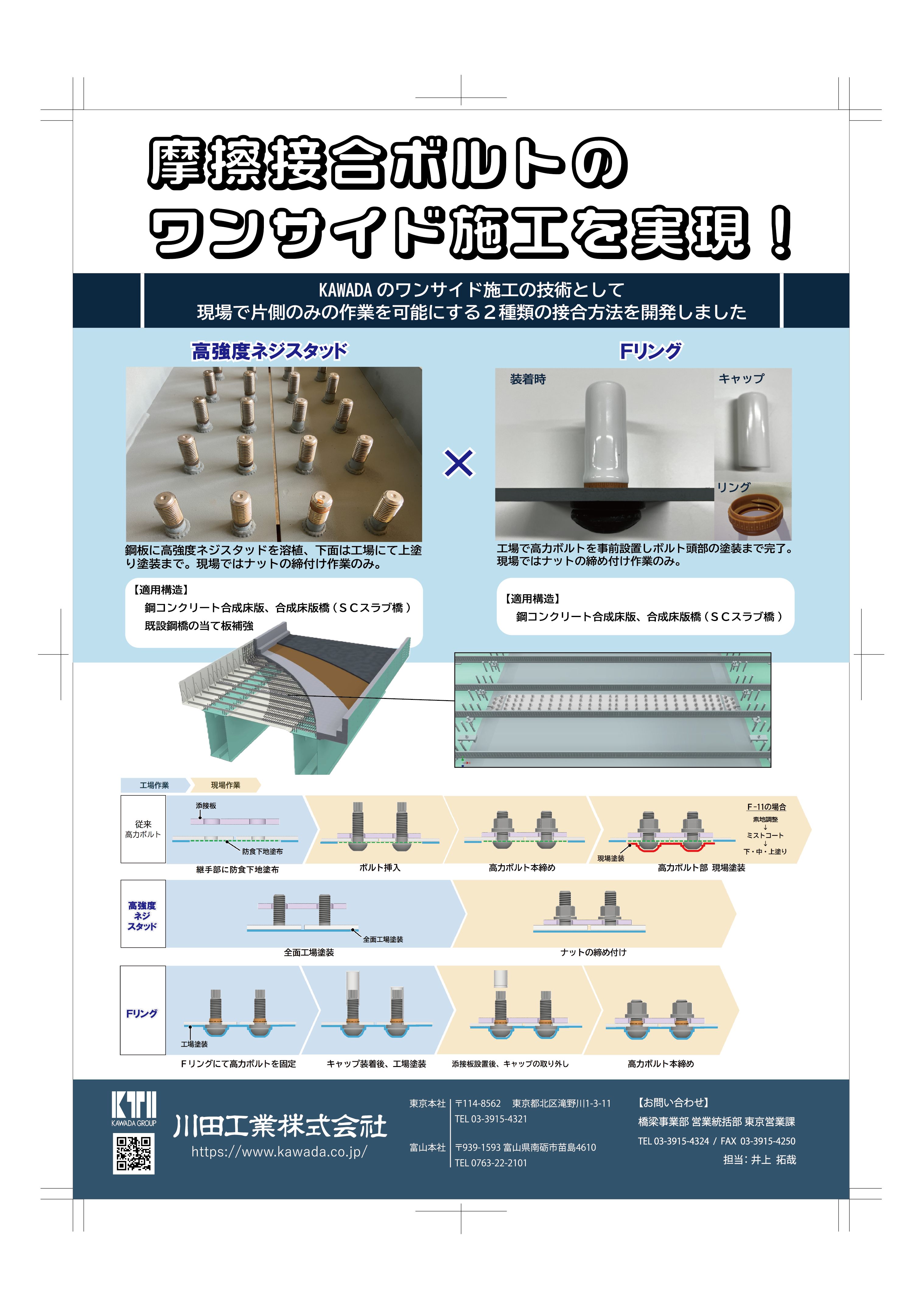 鋼構造のボルト接合には、高力ボルト摩擦接合が一般に使用されています。従来は、ボルトを挿入後、ナットを締付け、締付け完了後にボルト頭部の現場塗装が必要でした。これに対し、当社のワンサイド技術として現場で片側のみの作業にできる2種類の接合方法①と②を開発しました。①Fリングは工場で高力ボルトを事前設置してボルト頭部の塗装まで完了、現場ではナットの締め付け作業のみ。②高強度ネジスタッドは鋼板に高強度ネジスタッドを溶植、現場ではナットの締付け作業のみ。 となります。 |