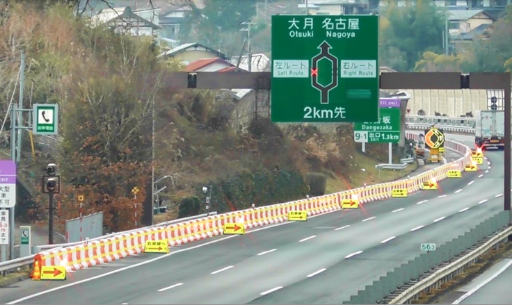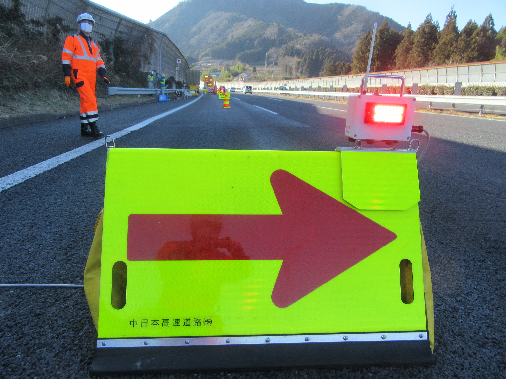 [規制先端部誘導灯「シンクロピカッチ」] 交通規制をできるだけ早くお客さまに知らせて、車線変更していただくことにより、お客さまとともに規制内で働いている人の安全を向上させるLED 警告灯で、昼間でも視認性は抜群です。シンクロピカッチは、超高輝度LED警告灯「ピカッチ」をシステム化することにより連動させ、明るい日中でも遠くからドライバーが車線規制の存在に気付き、 スムーズに車線変更を促すことができるよう、飛行場の誘導灯のように流れることによって、規制先端部の視認性をより高めます。 |