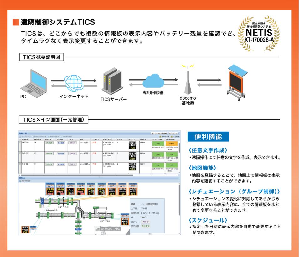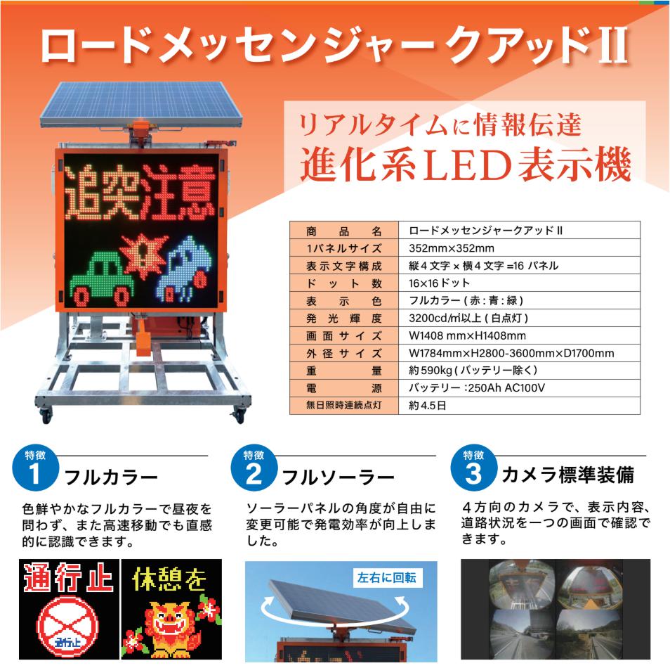 【特徴】 ■今までのLED表示機のサイズ感で表示面を約20%大きくしました ■フルカラーで、標識や白線の表現も違和感なく直感的に情報を伝えます ■フルソーラーで電源の確保は不要です(100V電源を用いる事により、より高輝度で表示が可能です) ■マルチカメラ内蔵で、表示内容、道路状況を一つの画面で確認できます ■遠隔操作にて任意の入力文字を表示させられます(各行最大8文字まで) ■現地に設置したまま絵図を含めた新しい文字情報を登録する事ができます ■複数機器の一元管理が可能で、機器の状態が一つの画面で一目瞭然です ■過去の運用ノウハウから品質向上対策を数多く取り入れております |