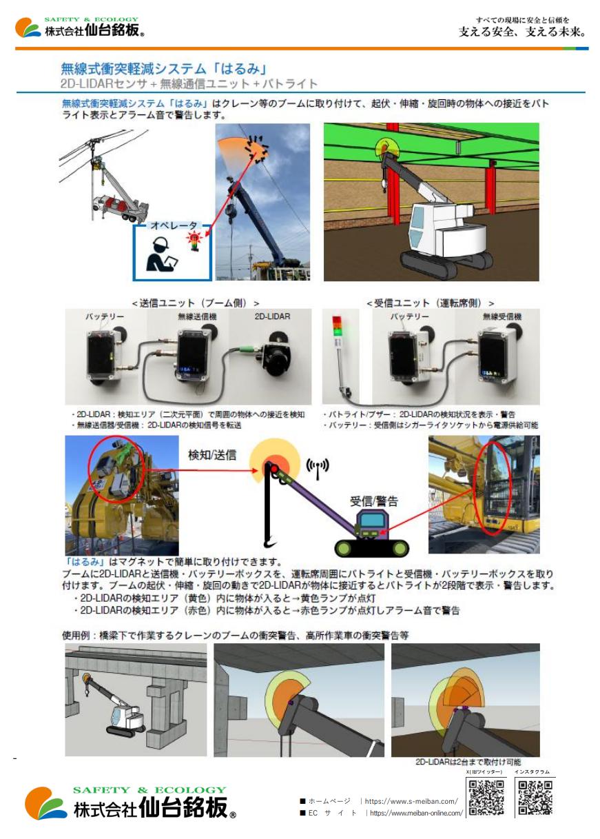 無線式架空線検知 LiDARセンサーは、クレーン等のブームに取り付けて、起伏・伸縮・旋回時の物体への接近をパトライト表示とアラームで警告します。