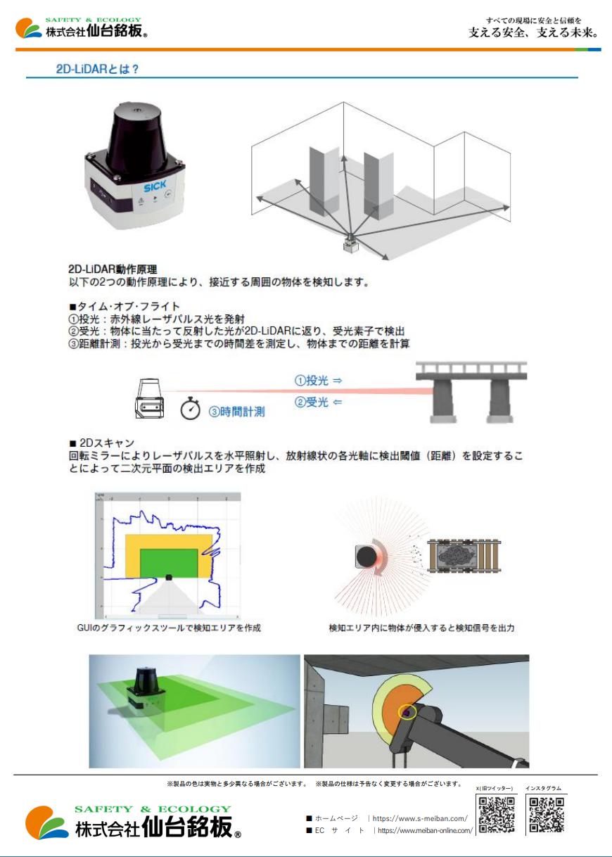 2D-LiDAR動作原理 以下の2つの動作原理により、接近する周囲の物体を検知します。 ■タイム・オブ・フライト ①投光:赤外線レーザパルス光を発射 ②受光:物体に当たって反射した光が2D-LiDARに返り、受講素子で検出 ③距離計測:投光から受講までの時間差を測定し、物体までの距離を計算 上記により、より精度の高い検出能力を確保した。 ■2Dスキャン |